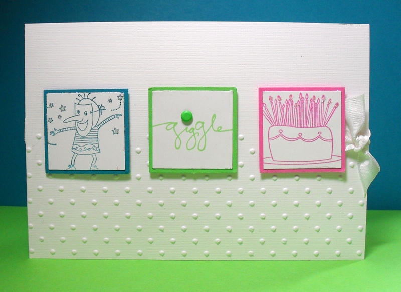Up top we have the owl from Owl Together Now (on the last chance list) sitting over an opening punched from the 3.5cm circle punch. This next one is a simple one-layer card, also featuring Owl Together Now. The frame was created by masking the centre with scrap paper and stamping over with a background stamp. Hmmm, is that a sneak peek of a NEW stamp available from next month???