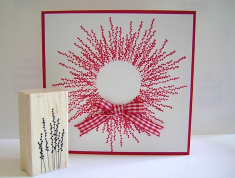 This wreath is made with the lavendar stamp from Pocket Sillhouettes (p72 Idea Book & Catalogue). Debbie learned this technique from another demonstrator at our Melbourne Regional training day a few months ago (sorry, not sure who that was but I’ll try to find out). Debbie punched a circle and adhered it to the centre with repositionable adhesive to mask the inner circle, before stamping the lavendar all around. Remove the paper, and voila! Love it.