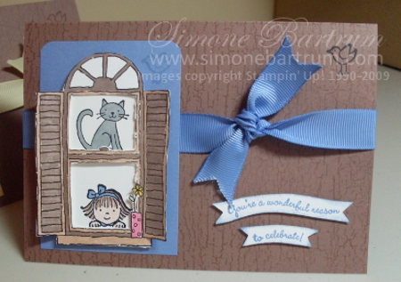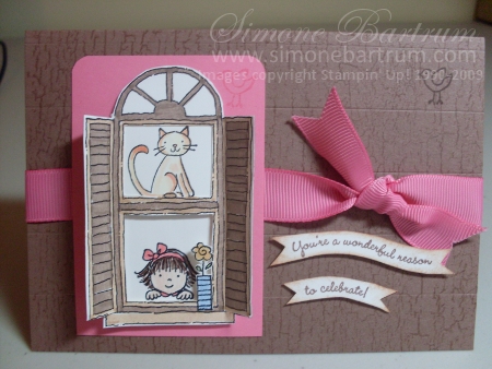 The window was snipped out and layered over a co-ordinating cardstock panel. We coloured the window with markers, mainly Close To Cocoa (same as the cardstock base) and Creamy Caramel. This was all mounted over the separate ‘windows’ with Stampin’ Dimensionals so that it is very 3D in real life. We scored and folded the shutters a little and even colored the back of the shutters with markers for a more finished look. The sentiment is from Curvy Verses (p116 IB&C). The background stamp is called Weathered, and was stamped in Versamark on the Cocoa card.