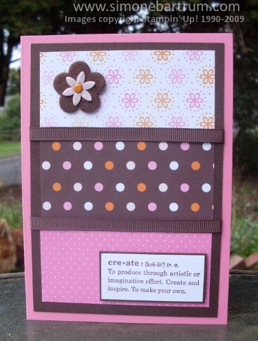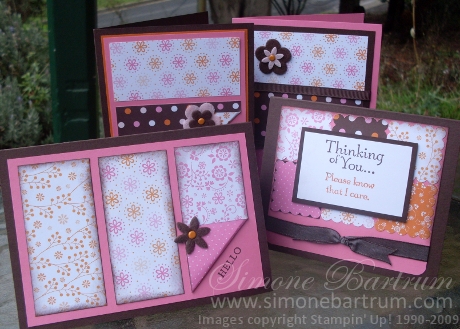 This is an easy cardmaking technique as it uses up strips of paper, and is very quick and simple. The DSP coordinates perfectly with Choc Chip. Regal Rose, Pumpkin Pie and Pink Pirouette.